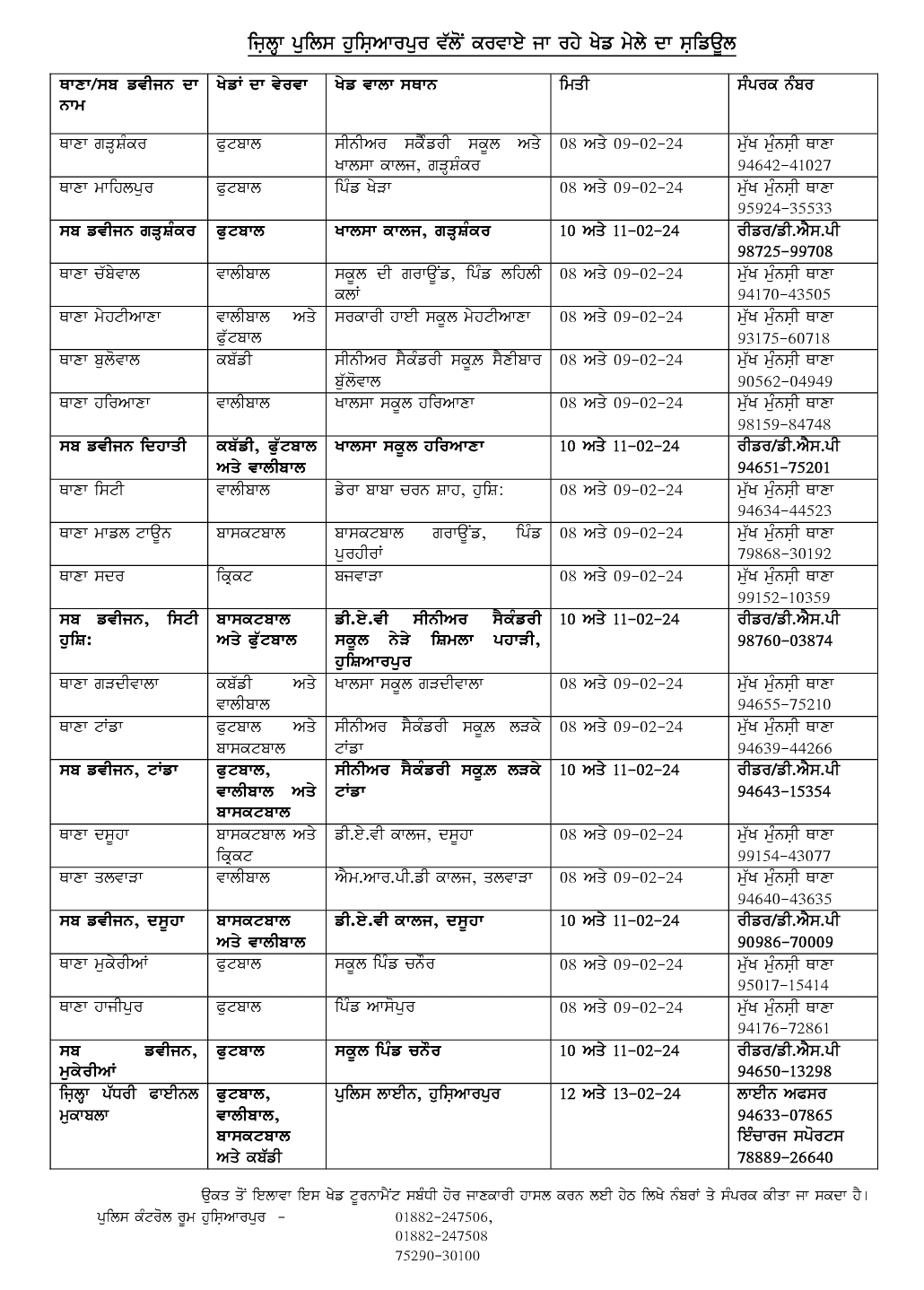 ਸ੍ਰੀ ਸੁਰੇਂਦਰ ਲਾਂਬਾ, ਆਈ.ਪੀ.ਐਸ.. ਸੀਨੀਅਰ ਕਪਤਾਨ ਪੁਲਿਸ, ਹੁਸਿਆਰਪੁਰ ਵੱਲੋਂ ਆਪ ਸਭ ਨੂੰ ਇਸ Special Drug Awareness Campaign (Sports Meet) ਵਿਚ ਯੋਗਦਾਨ ਪਾਉਣ ਅਤੇ ਇਸ ਨੂੰ ਕਾਮਯਾਬ ਬਣਾਉਣ ਲਈ ਅਪੀਲ ਕੀਤੀ ਜਾਂਦੀ ਹੈ। ਥਾਣਾ, ਸਬ-ਡਵੀਜ਼ਨ ਅਤੇ ਜਿਲ੍ਹਾ ਪੱਧਰ ਤੇ ਕਰਵਾਏ ਜਾ ਰਹੇ ਟੂਰਨਾਮੈਂਟਸ ਦਾ ਮਿਤੀਵਾਰ ਵੇਰਵਾ ਨਾਲ ਨੱਥੀ ਹੈ।