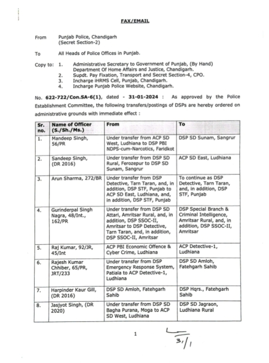 ਪੰਜਾਬ ਪੁਲਿਸ ਦੇ 45 ਅਧਿਕਾਰੀਆਂ ਦਾ ਫੇਰਬਦਲ.. ਪੜ੍ਹੋ ਸੂਚੀ Post published:February 1, 2024 ਚੰਡੀਗੜ੍ਹ (PPT NEWS) : ਪੰਜਾਬ ਪੁਲਿਸ ਦੇ 45 ਅਧਿਕਾਰੀਆਂ ਦਾ ਫੇਰਬਦਲ ਕੀਤਾ ਗਿਆ ਹੈ ।ਪੜ੍ਹੋ ਸੂਚੀ Post Views: 361 Read more articles Previous Postਬਲਾਕ ਟਾਂਡਾ -2 ਦੇ ਬਲਾਕ ਪੱਧਰੀ ਰਾਣੀ ਲਕਸ਼ਮੀ ਬਾਈ ਆਤਮ ਸੁਰੱਖਿਆ ਕਰਾਟੇ ਟੂਰਨਾਮੈਂਟ(ਲੜਕੀਆਂ) ਸਫਲਤਾ ਪੂਰਵਕ ਸੰਪੰਨ ਹੋਇਆ Next Postਦਸੂਹਾ ਹਲਕੇ ਵਿੱਚ ਕੇਂਦਰ ਸਰਕਾਰ ਦੇ ਵਿਕਾਸ ਕਾਰਜਾ ਤੇ ਮੌਜੂਦਾ ਸਰਕਾਰਾਂ ਦੇ ਨੁਮਾਇੰਦੇ ਉਦਘਾਟਨ ਕਰਕੇ ਫ਼ੋਕੀ ਸ਼ੋਹਰਤ ਹਾਸਲ ਕਰਨ ਦੀ ਦੌੜ ‘ਚ : ਸੰਜੀਵ ਮਿਨਹਾਸ You Might Also Like LATEST… ਪੰਜਾਬ ਸਰਕਾਰ ਵੱਲੋਂ ਪੈਨਸ਼ਨਰ ਤੇ ਪਰਿਵਾਰਕ ਪੈਨਸ਼ਨ ‘ਚ ਕੀਤਾ ਵਾਧਾ November 9, 2021 BREAKING NEWS .. ਕਾਂਗਰਸ ਹਾਈ ਕਮਾਨ ਵਲੋਂ ਪੰਜਾਬ ਕਾਂਗਰਸ ਦੇ ਨਵੇਂ ਪ੍ਰਧਾਨ ਦਾ ਐਲਾਨ.. ਜਾਣੋ ਕੌਣ ਹੋਵੇਗਾ.. April 9, 2022 PES(G-A) ਕਾਡਰ ਦੇ ਅਧਿਕਾਰੀਆਂ ਦੀਆਂ ਤੈਨਾਤੀਆਂ/ਬਦਲੀਆਂ,ਧੀਰਜ ਵਸ਼ਿਸ਼ਟ ਡਿਪਟੀ ਡੀ ਈ ਓ (ਸੈ,ਸਿ) ਤੇ ਤਰਲੋਚਨ ਸਿੰਘ ਡਿਪਟੀ ਡੀ ਈ ਓ (ਐ.ਸਿ) ਤੈਨਾਤ July 6, 2022 ਪੰਜਾਬ ਪ੍ਰਦੇਸ਼ ਕਾਂਗਰਸ ਕਮੇਟੀ ਨੇ ਸਪੈਸ਼ਲ ਸਪੋਕਸਪਰਸਨ ਅਤੇ ਸਟੇਟ ਸਪੋਕਸਪਰਸਨ ਐਲਾਨੇ.. ਪੜ੍ਹੋ ਲਿਸਟ August 1, 2022 ਆਮ ਆਦਮੀ ਪਾਰਟੀ ਵਲੋਂ ਵੱਡਾ ਐਲਾਨ, CM ਦਾ ਚੇਹਰਾ.. January 4, 2022