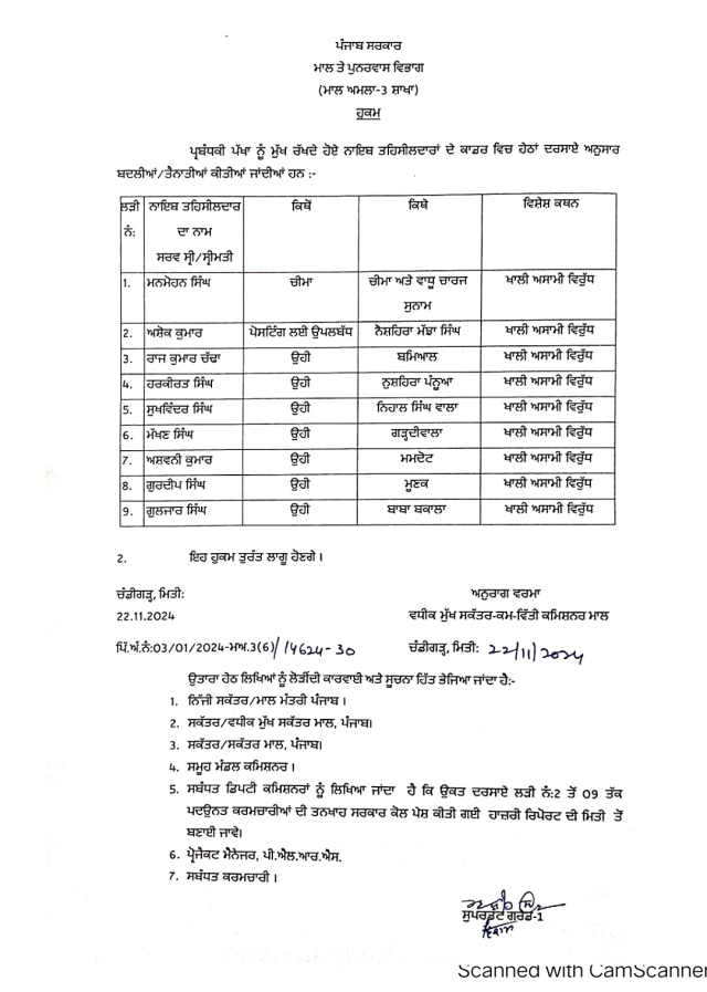 ਮਾਲ ਵਿਭਾਗ ਵਲੋਂ 9 ਨਾਇਬ ਤਹਿਸੀਲਦਾਰਾਂ ਦਾ ਤਬਾਦਲਾ… ਪੜ੍ਹੋ ਲਿਸਟ Post published:November 23, 2024 ਚੰਡੀਗੜ੍ਹ 23 ਨਵੰਬਰ (PPT NEWS) : ਮਾਲ ਵਿਭਾਗ ਵਲੋਂ ਵਲੋਂ ਪ੍ਰਬੰਧਕੀ ਪੱਖਾਂ ਨੂੰ ਮੁੱਖ ਰੱਖਦੇ ਹੋਏ 9 ਨਾਇਬ ਤਹਿਸੀਲਦਾਰਾਂ ਦੇ ਕਾਡਰ ਵਿਚ ਹੇਠਾਂ ਦਰਸਾਏ ਅਨੁਸਾਰ ਬਦਲੀਆਂ/ਤੈਨਾਤੀਆਂ ਕੀਤੀਆਂ ਗਈ ਹਨ… ਪੜ੍ਹੋ ਲਿਸਟ Post Views: 441 Read more articles Previous Postਪੰਜਾਬ ਵਿੱਚ ਖੇਡਾਂ ਨੂੰ ਪ੍ਰਫੁੱਲਤ ਕਰਨਾ ਸਮੇਂ ਦੀ ਮੁੱਖ ਲੋੜ : ਸੰਜੀਵ ਮਨਹਾਸ Next Postਮੋਟਰਸਾਈਕਲ ਅਤੇ ਵਹੀਕਲਾਂ ਦੇ ਟਾਇਰ ਚੋਰੀ ਕਰਨ ਵਾਲੇ 3 ਨੌਜਵਾਨ ਆਏ ਪੁਲਿਸ ਅੜਿੱਕੇ You Might Also Like ਪੰਜਾਬ ਸਰਕਾਰ ਨੇ ਜਿਲਾ ਯੋਜਨਾ ਬੋਰਡ ਦੇ ਲਾਏ 15 ਚੇਅਰਮੈਨ, ਕਰਮਜੀਤ ਕੌਰ ਨੂੰ ਜਿਲਾ ਹੁਸ਼ਿਆਰਪੁਰ ਦਾ ਚੇਅਰਮੈਨ ਲਗਾਇਆ.. ਦੇਖੋ ਲਿਸਟ January 9, 2023 ਆਈ ਪੀ ਐਸ ਤੇ ਪੀ ਪੀ ਐਸ ਅਧਿਕਾਰੀਆਂ ਦਾ ਹੋਇਆ ਫੇਰਬਦਲ January 4, 2022 ਆਮ ਆਦਮੀ ਪਾਰਟੀ ਨੇ ਵਿਜੈ ਸਾਂਪਲਾ ਦੇ ਬੇਹੱਦ ਕਰੀਬੀ ਰਹੇ ਸ਼ੀਤਲ ਅੰਗੂਰਾਲ ਸਮੇਤ 15 ਹੋਰ ਉਮੀਦਵਾਰਾਂ ਨੂੰ ਚੋਣ ਮੈਦਾਨ ਚ ਉਤਾਰਿਆ December 28, 2021 2 ਸੀਨੀਅਰ ਆਈ ਪੀ ਐਸ ਅਫ਼ਸਰਾਂ ਦਾ ਤਬਾਦਲਾ.. ਦੇਖੋ ਲਿਸਟ April 4, 2022 ਚੌਧਰੀ ਰਾਜਵਿੰਦਰ ਰਾਜਾ ਵਲੋਂ ਸ਼ਹੀਦੀ ਦਿਹਾੜੇ ਤੇ ਦਿੱਲੀ ਦੀ ਵਿਸ਼ਾਲ ਰੈਲੀ ਚ ਸ਼ਿਰਕਤ ਕਿੱਤੀ March 24, 2023